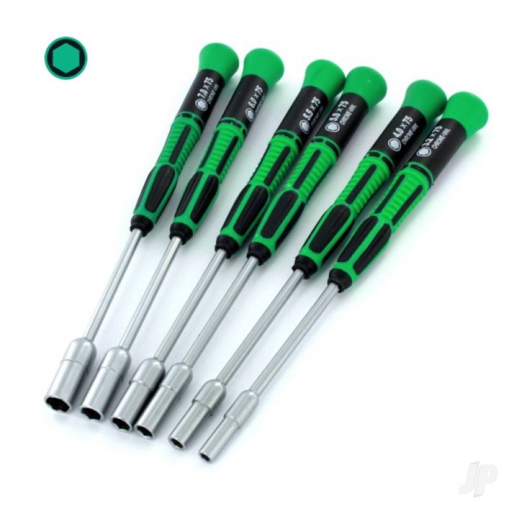 - Set of 6 nickel chrome molybdenum alloy steel nut drivers: 3.2, 4.0, 5.0, 5.5, 6.0, 7.0 x 75mm