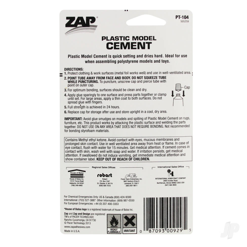 Zap Plastic Model Cement is a quick setting, water resistant glue that bonds polystyrene plastic models and toys. It dries clear and works aluminium, china, cloth, fibreglass, metal, most plastics, pottery, rubber and wood