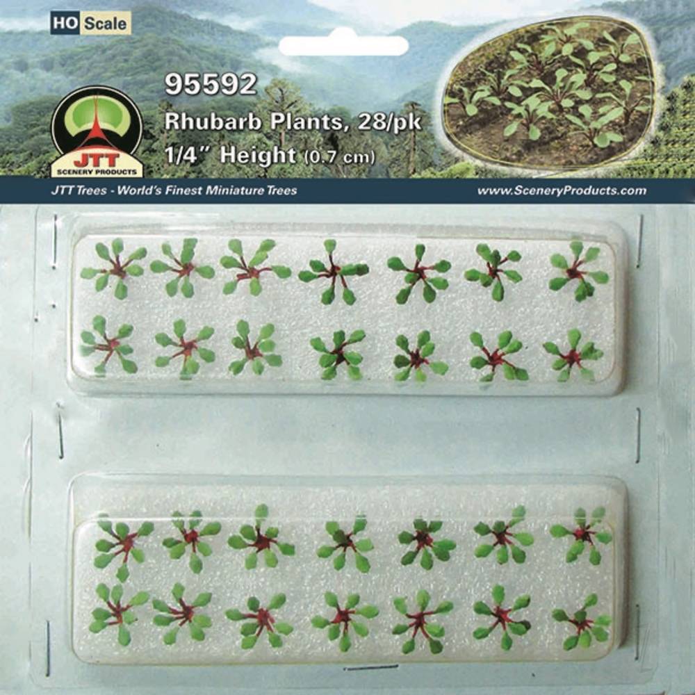 These scale Rhubarb Plants, in full-season bloom, will add another dimension to your layout. Leaves are carefully contoured with red stalks and green leaves. Plant them in rows or individual to brighten just about any scene. For more realism, create a wire cage around them or stake the plant with wooden supports, or plant them in a miniature flower pot.