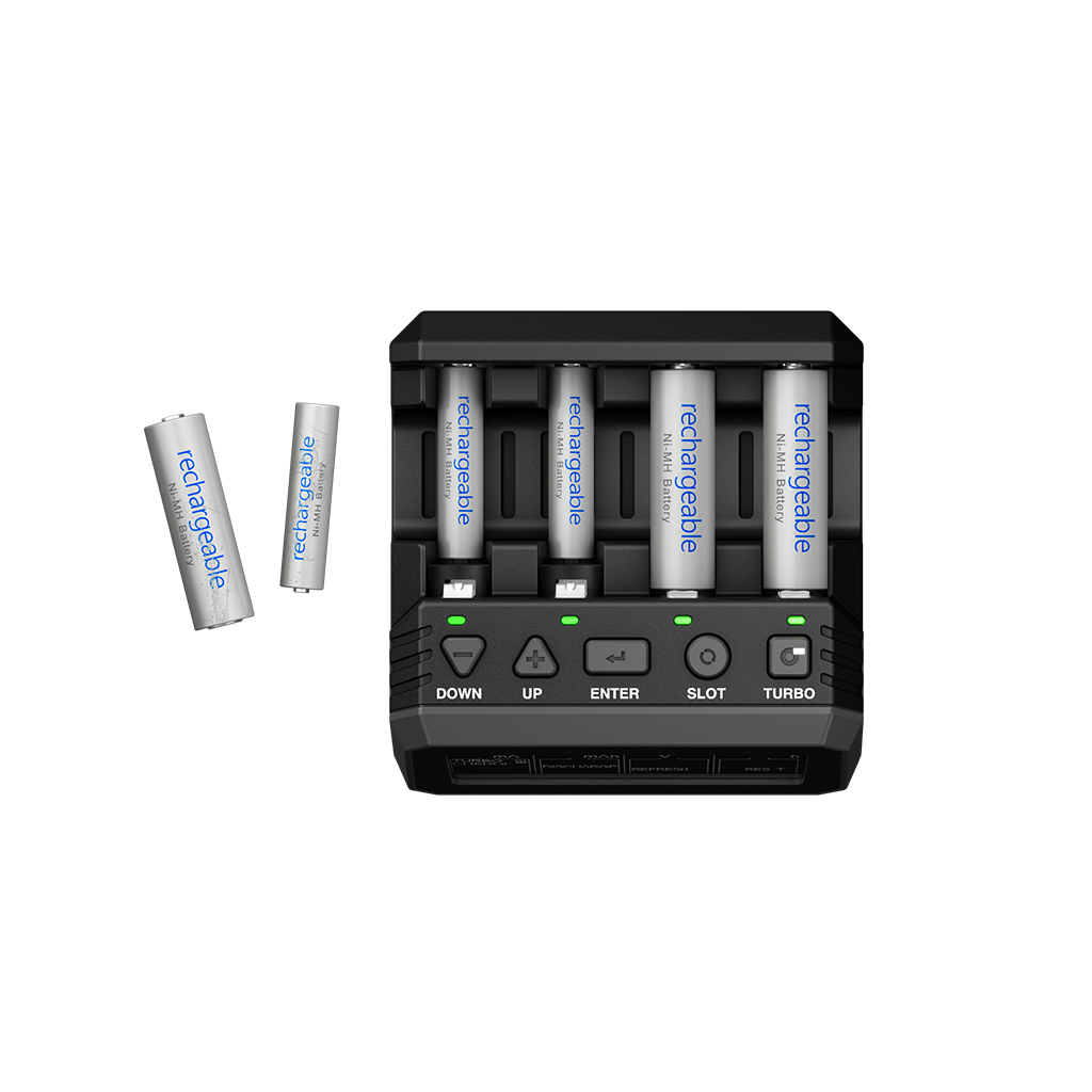 It can handle 1 to 4 AA and AAA NiMH/NiCD rechargeable batteries via four independent charging slots with its respective interface.