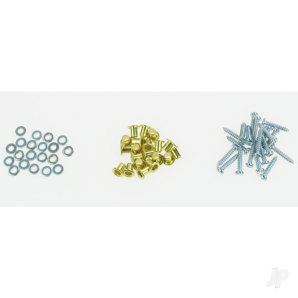 Small servo mounting hardware. 60 pieces, enough for 5 servos. 20- #2-32×7/16 phillips panhead sheet metal screws, 20- 2-56 flat washers, 20 Brass Eyelet spacers. 5 sets/pkg. Weight: 1.8 grams / set.