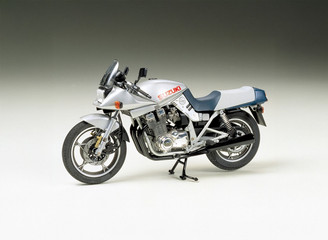 Making its exciting debut in 1980 at the IFMA trade show in Cologne, Germany and later released to the public in 1981 was the Suzuki GSX1100S Katana. The aggressive form of the Katana designed by Hans Muth is reproduced by this plastic model assembly model kit. The mechanical mood of the 4-cylinder DOHC engine, along with ignition cords, brake pipes, and instrument cables which are reproduced with vinyl tubing, has been precisely captured. In addition, metal screws are included to provided extra strength to parts such as the wheel axles. Solid synthetic rubber tyres front and rear have tread patterns, and are mounted onto accurately reproduced renderings of Suzuki’s famed star-shaped die-cast wheels to provide the model with a highly realistic presence.