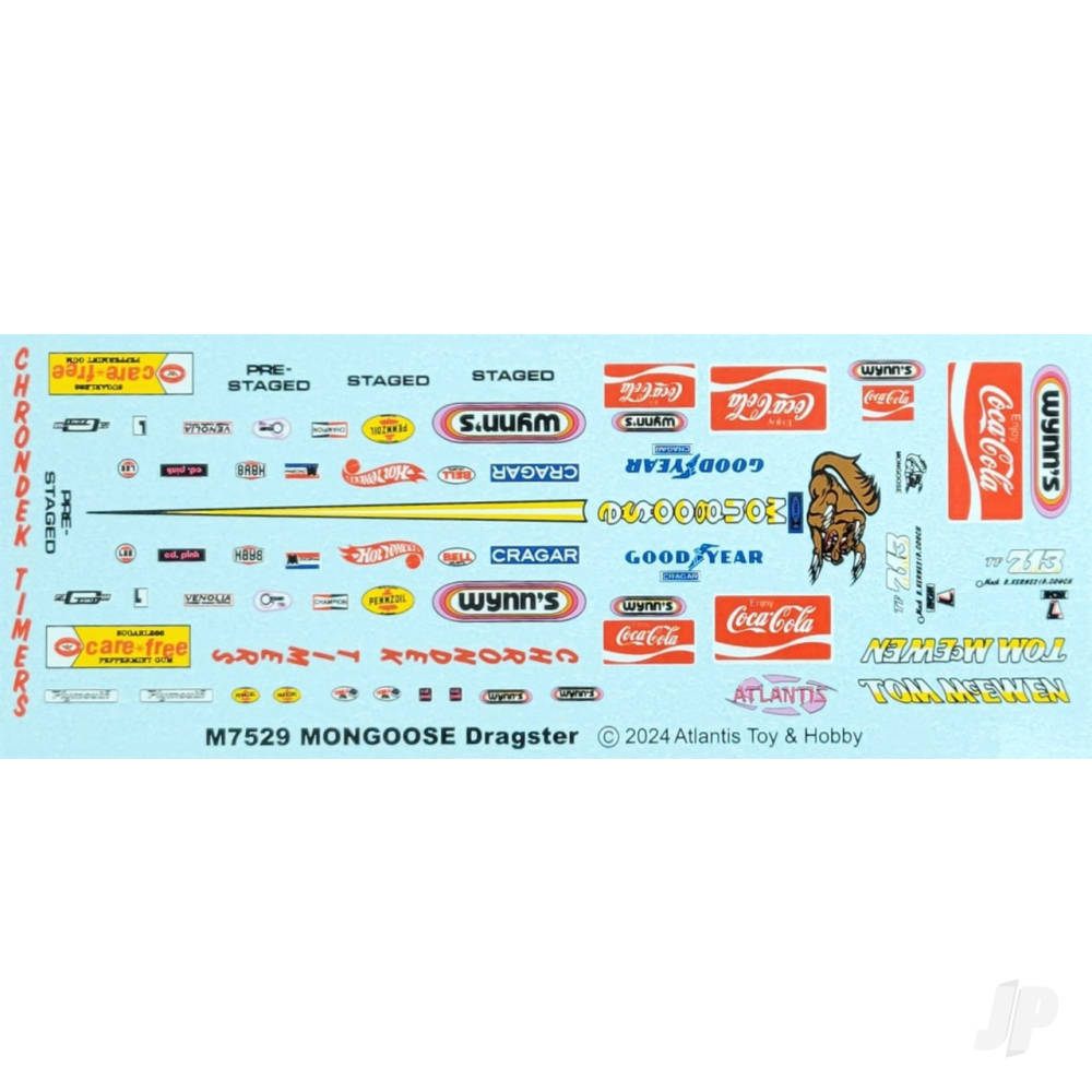 The fastest class of standing start racers is represented by Tom McEwen’s famous digger ‘The Mongoose’. This kit has a fully detailed engine, 1-piece chassis frame, removable body panels, roll cage, seated driver, filigree steering linkage, rear wing, standing crew figure, starting ‘Christmas Tree’, chrome-plated trim parts plus vinyl tires, ignition wires, fuel and oil lines. Decals represent colourful racing livery and sponsor logos.