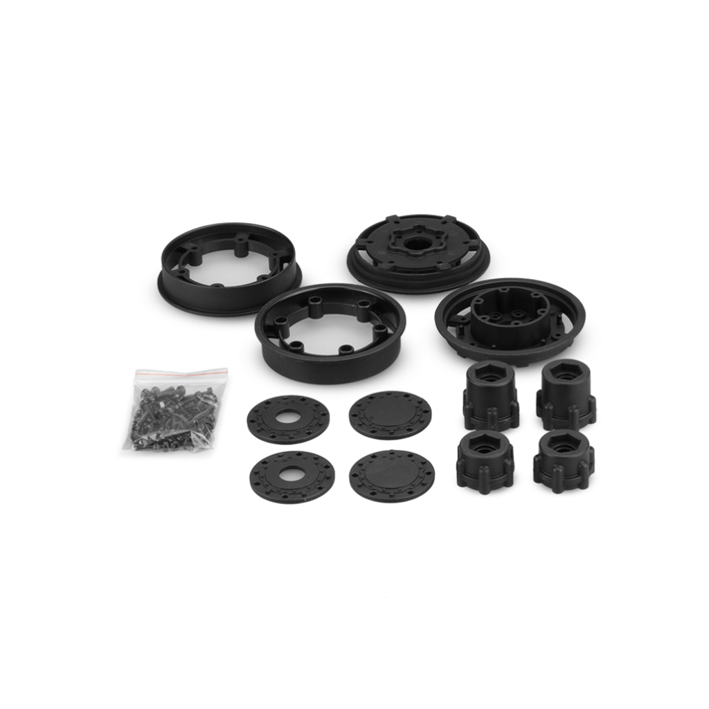 The inner wheel aligns and installs with six M2.5x12mm SHCS to the outer portion and secured with plain nuts on the outside to visually look accurate. The inner wheel contains the assembly screws which are hooped together and cleanly bracketed to the inner wheel bead. Add separately available #3189-010 Transporter tire to the wheel and place on vehicle of choice and secure with wheel nut (not included). Finalize by adding the planetary cover of choice with included and remaining hardware.