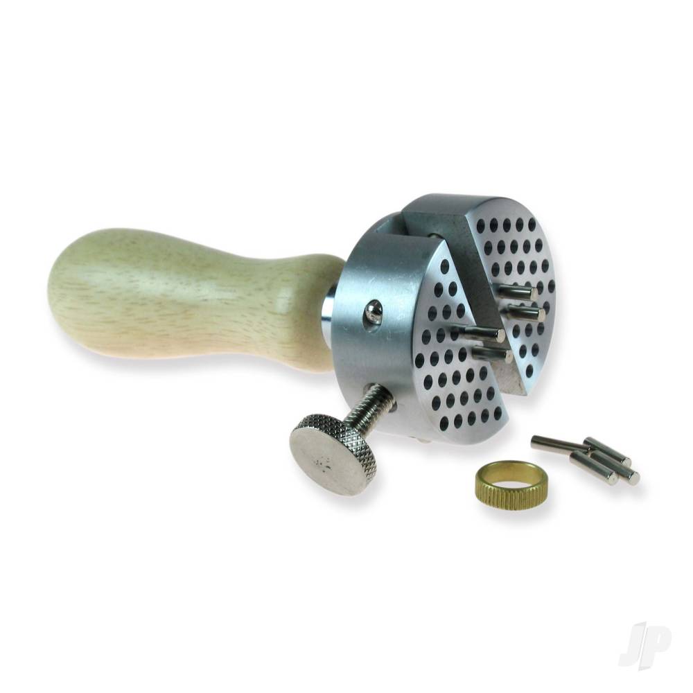 A versatile support tool for holding odd shapes & smaller components while painting, filing, sawing, engraving or glueing. The clamp head can be removed from the base and fitted to a larger bench vice if required. The wooden handle is fitted with inbuilt rubber ring making the work holder stable & non-slip. The work holder can grip from the outside or from within. The pins can also be used for bending and forming wire. Kit includes 8 steel pins which can be placed anywhere on the head to accommodate various shapes.
