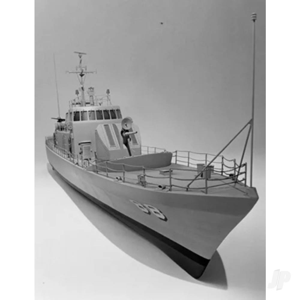 The U.S.S. Crockett was one of seventeen gunboats in the Asheville Class. This class has the distinction of being the first group of Navy ships to be powered by a gas turbine. The Crockett was capable of a top speed of 50 knots, but more impressive still was the fact that she could accelerate her 230 tonnes from 0 to 40 knots in 60 seconds. Stationed in South Vietnam, the Crockett was designed for coastal patrol, blockade reconnaissance, and support missions. But rest assured, when duty called, the crew of the U.S.S. Crockett could get there in a hurry. The Dumas model of the Crockett is a builder’s boat. She features balsa plank-over Die cut mahogany frame construction for the hull and conventional Die cut construction for the superstructure. #2105 is an optional deck hardware kit with more than 80 cast fittings. Included in the deck hardware are all the armaments needed to send her into battle. #2341 is the twin-screw running hardware kit used to drive the Crockett. It has everything needed to complete your driveline except motors. Use two Dumas motors #2004 for 6V power. If you are a military enthusiast, you will certainly want to try your hand at the Dumas U.S.S. Crockett.