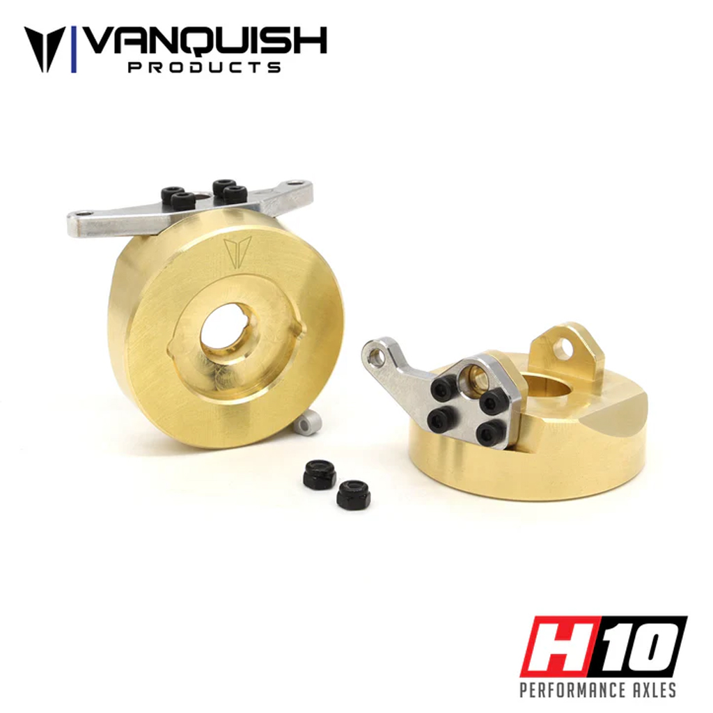 The Vanquish Products H10 Brass Steering Knuckles are a direct replacement for H10 axles on the H10 Optic RTR and Kit. The H10 Brass Steering Knuckles are built to add weight to the front of your truck, down low where it counts. They feature a thick stainless steel steering arm that bolts to the top of the knuckle for a high clearance design.