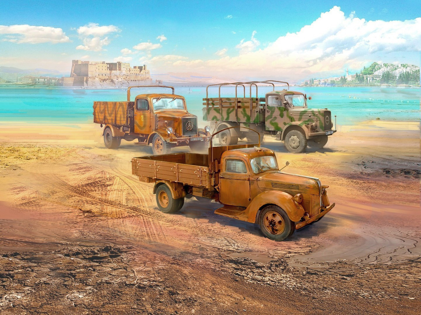 The set includes three German World War II three-tonne truck model kits, with a V3000S, KHD S3000, and an L3000S. An ideal plastic model assembly kit for keen modellers who want to create a diorama display.
