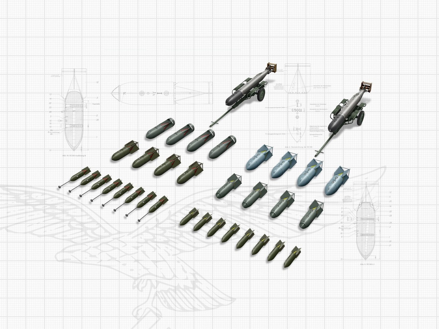 • The set includes 50kg, 250kg, and 500kg bombs of SC and SD types including options with Dinort rods