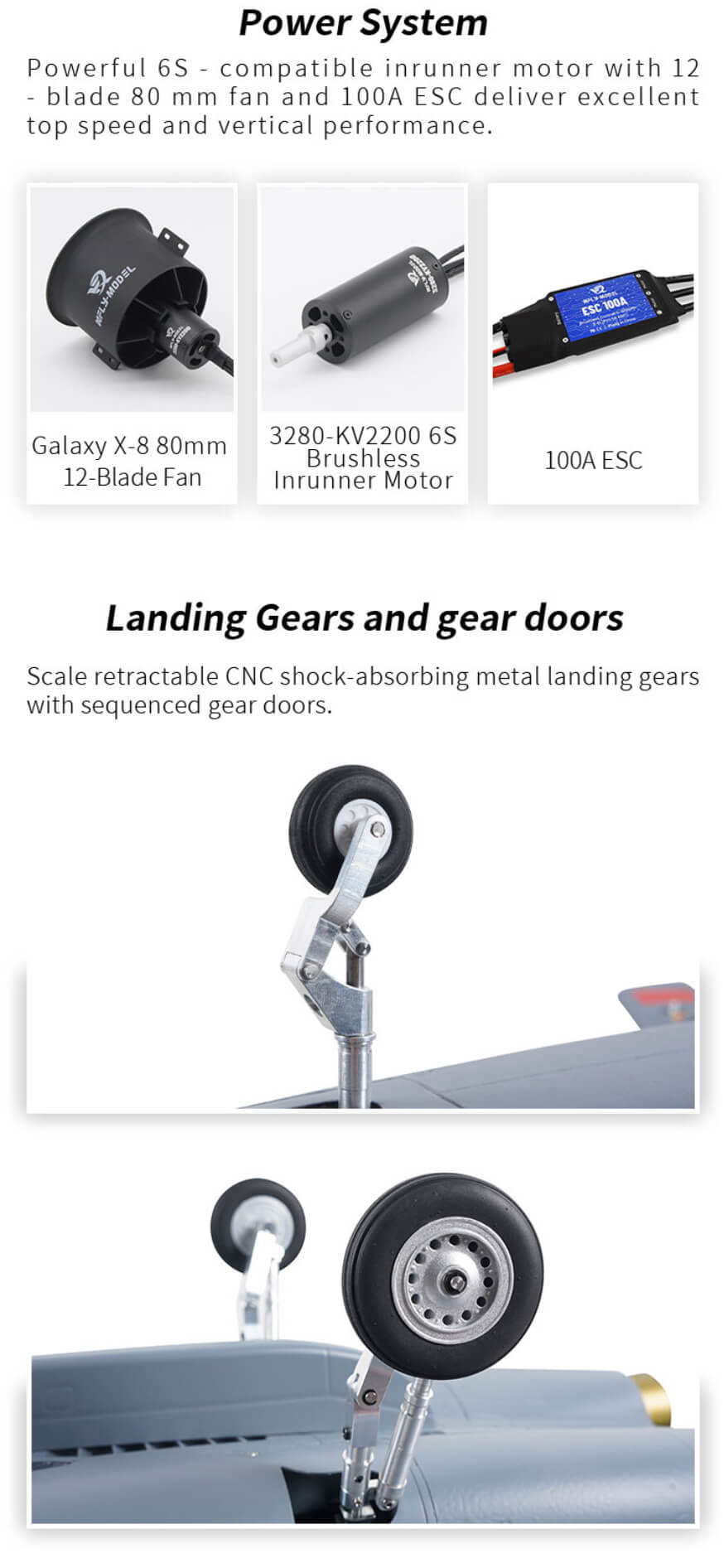 The stock power system includes high-efficicent 12 blade 80mm fan, 6S-compatible brushless inrunner motor and 100A ESC that delivers top speed, vertical performance and turbine like sound with 6S LiPo battery. Integrated wing connectors and glueless design facilitate fast and easy assembley – only 8 screws needed to get the Alpha jet almost ready to fly.
