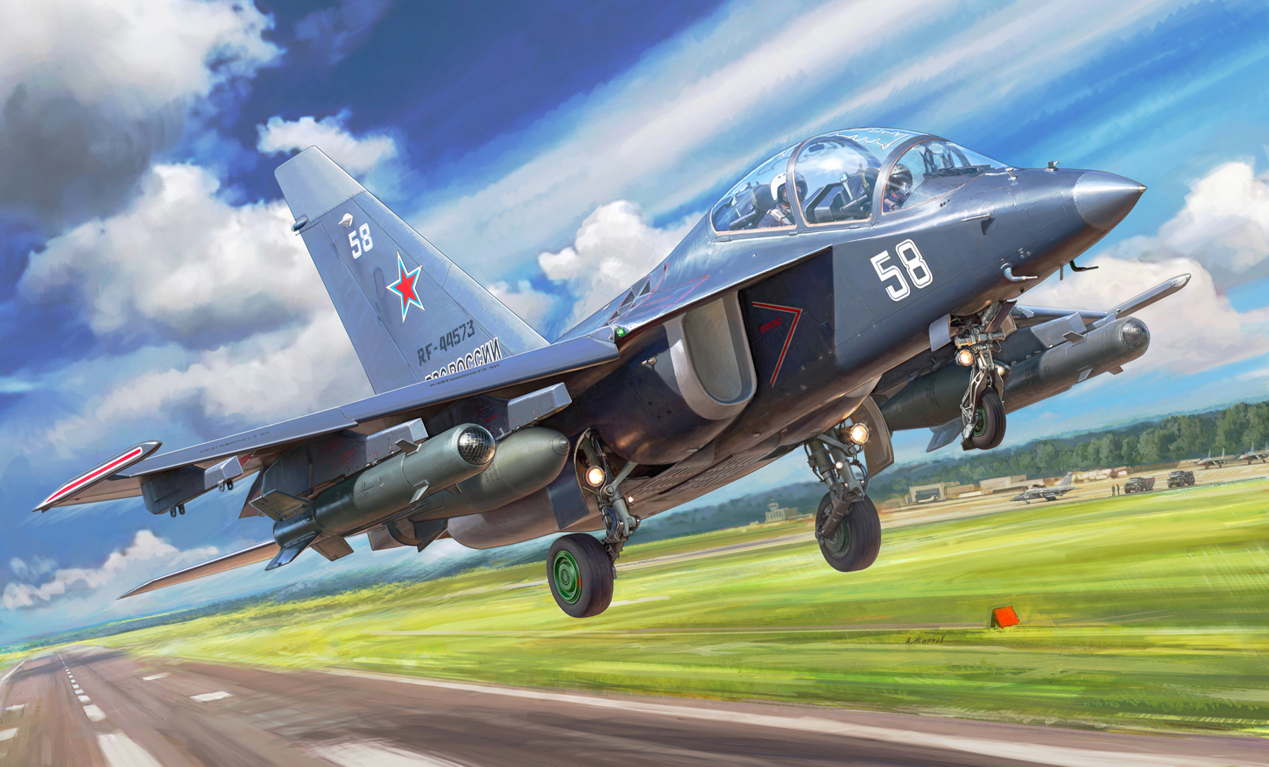 The Yakovlev YAK-130 is a two-seat trainer and light attack plane in service since 2009. It can be equipped with a series of bombs and missiles on 9 weapon stations. The YAK-130 is in service in Russia, Belarus, Algeria and some South East Asian countries. Kit consists of 439 parts. Decals for Russia (2x), Laos, Bangladesh included. Pilots included