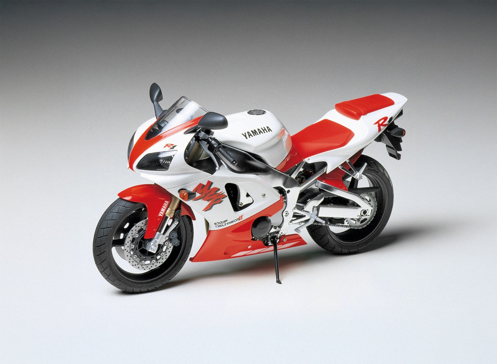 Making its debut at the 1997 Milan Motor Show was the Yamaha super sports YZF-R1, which was developed to be the fastest machine on winding roads. The compact design of the YZF-R1 as well as its sharp lines which include the cowlings and fuel tank are accurately reproduced as a plastic assembly model kit. The liquid-cooled 4-cylinder engine has been precisely rendered and features fine details such as cables that are depicted with vinyl tubing. The frame and swing bars come with a metal plated finish and an interchangeable single seat cowl and racing stand are also included with the kit.